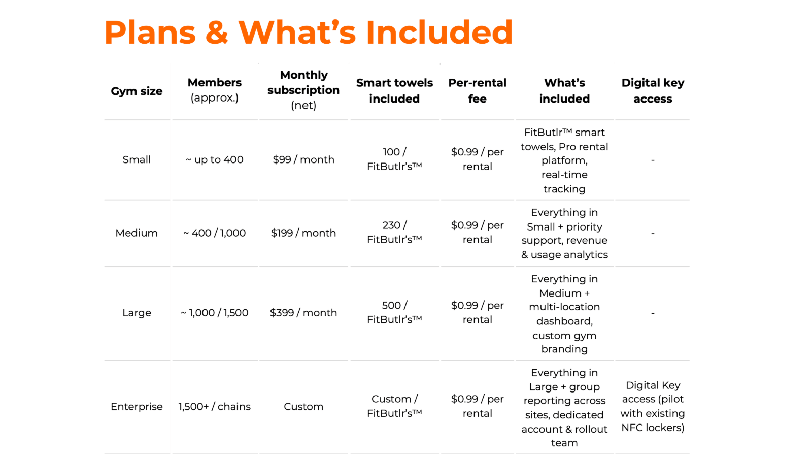 FitButlr™ Pro Rental Platform turns your towel line into a profit engine for your gym, delivering predictable recurring revenue — and the table shows how quickly each plan can pay for itself.